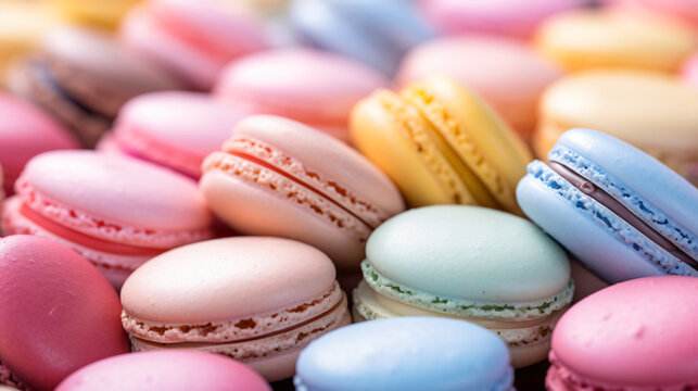 Immerse yourself in the exquisite world of French macarons with this captivating wallpaper. This close-up view captures the delicate beauty of pastel-colored macarons, showcasing their intricate detai