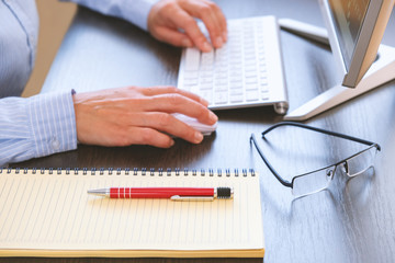 Office Desk with computer and keyboard in background. Notebook and pen are prepared for work records.