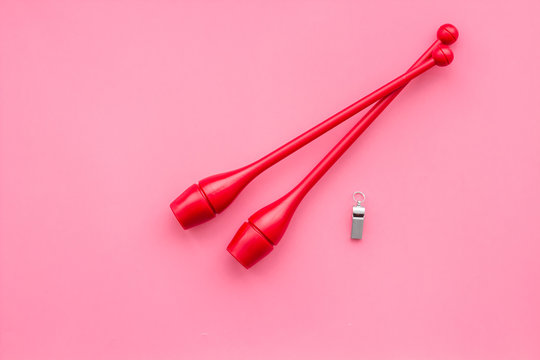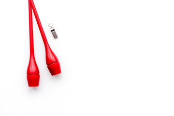 Beauty sport for girls concept. Maces for rhythmic gymnastics and ballet shoes on white background top view copy space