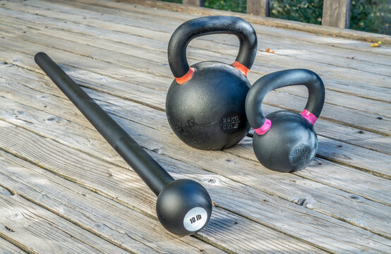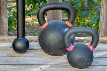 steel mace (or macebell) and iron kettlebells on a wooden deck, fitness concept using unconventional equipment