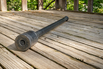 steel mace (or macebell) on a rustic wooden deck, functional fitness concept using unconventional equipment