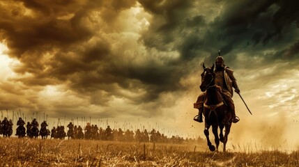 The legendary general Alexander the Great atop his steed inspires troops, with tempestuous clouds above