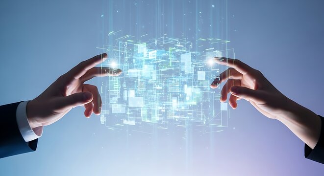 Hands interact with digital data cloud in futuristic environment, showcasing connectivity and innovation in a modern technological age.