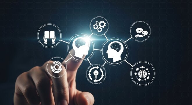 Finger touching digital interface with interconnected icons representing knowledge and learning