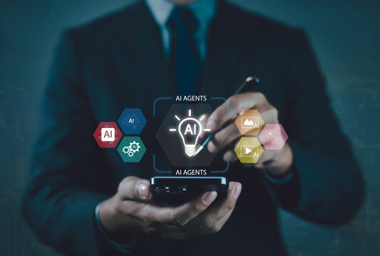 Business professional using generative AI interface on tablet with AI agent, chatbot and automation icons. Concept of artificial intelligence, AI assistant and digital innovation.