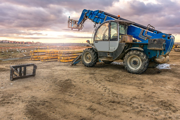 Forklift on a construction site, preparing to raise construction parts