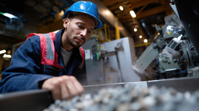 The image depicts a worker closely examining processed materials at a machinery station in a factory setting, emphasizing human interaction with modern industrial technology.