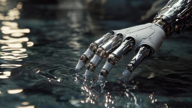 A shiny robotic hand dipping its fingers into a dark body of water. Concept Shiny robotic hand, Dark water reflections, Metallic textures, Sci-fi aesthetic, Water interaction