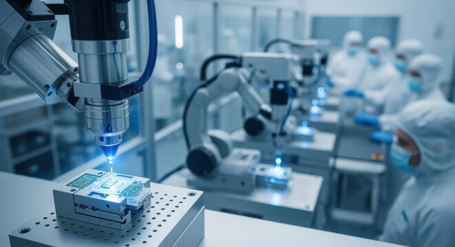 Industrial manufacturing of implantable biosensors featuring precision laser welding machines maintaining sterile conditions in production.