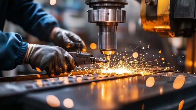 Sparks fly from a metalworking machine during precision machining in an industrial workshop