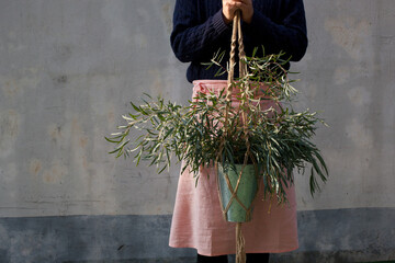Front view of a person in a navy sweater and pink apron holding the ropes of a macrame hanging planter with a full, leafy plant, standing against a raw concrete wall.