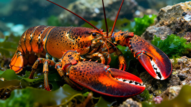 American lobster close up vibrant orange claws marine crustacean underwater ocean life sea creature deep water habitat rocky bottom algae fauna macro photography seafood delicacy gourmet food ingredie