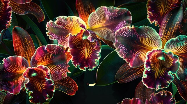 A cluster of beautiful orchids displays vibrant colors, thriving in a lush tropical setting, capturing the essence of nature's beauty
