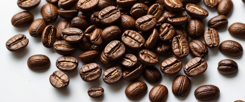 Close-up of roasted coffee beans arranged on white background showcasing rich brown color and texture of each bean
