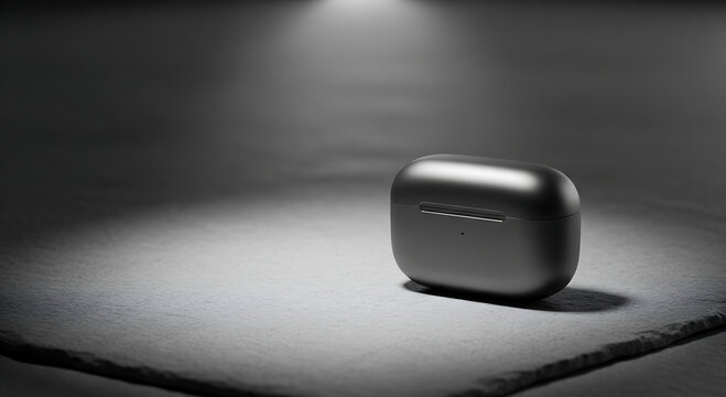 A sleek, modern wireless earbud charging case resting on a textured surface under a dramatic spotlight