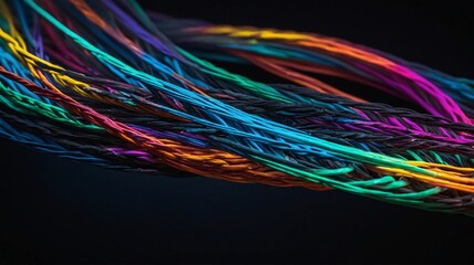 A vibrant array of twisted cables featuring shades of blue, pink, green, and black against a dark background.