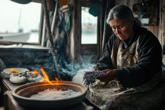 A woman preparing meal by fire outdoors, possible camping or wilderness adventure