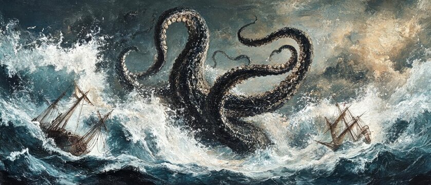 Kraken emerging from a maelstrom shipwrecks tangled in its tentacles
