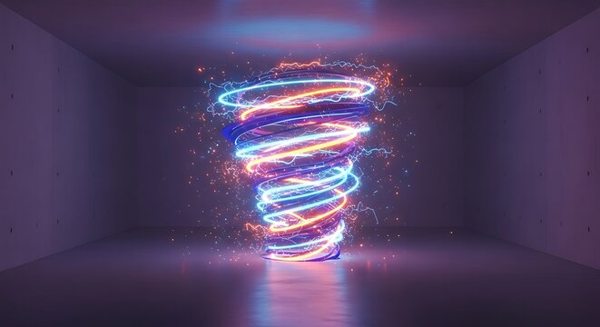 Dynamic luminous vortex amidst serene minimalist chamber interior