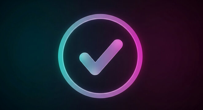 Neon checkmark in circle, glowing teal and magenta on dark background, symbolizes approval, confirmation, completion, success, and agreement