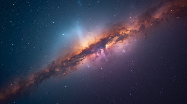 Vibrant swirling cosmic nebula of glowing orange, purple and blue clouds and distant stars evoking wonder and awe