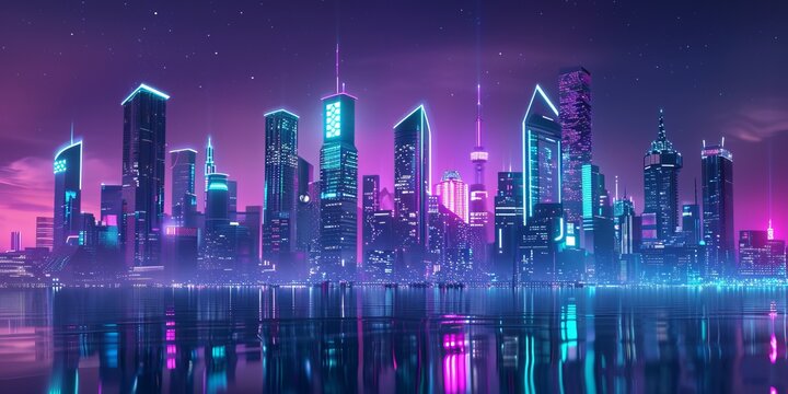 Sci-fi city skyline with magenta and emerald neon lights. Night scene with advanced skyscrapers. 3D Render.