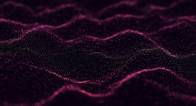 ​A creative data visualization with a futuristic wave of luminous purple and magenta pixels
