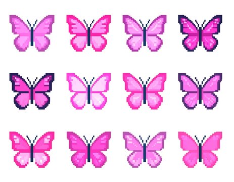 Pixelated array of vibrant, pink butterflies with various wing shades