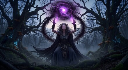 Enchantress of the Gloomy Forest A Witch Casting Spells Amidst Ancient Trees and Mystical Energies