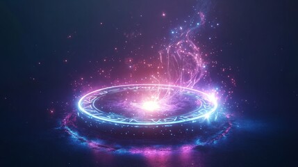 Isometric floating magic circle with radiant runes and sparkling light, glowing with energy