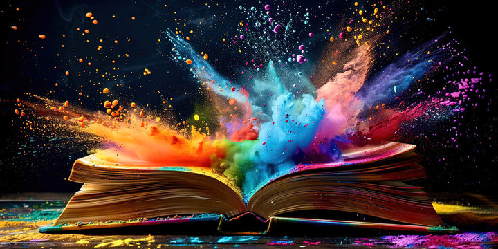 An open book with exploding colors