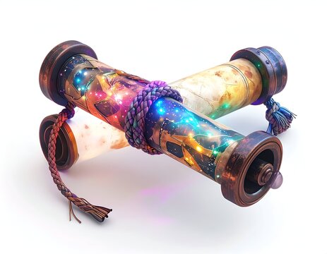 Two crossed scrolls, illuminated with starlight, bound with rope
