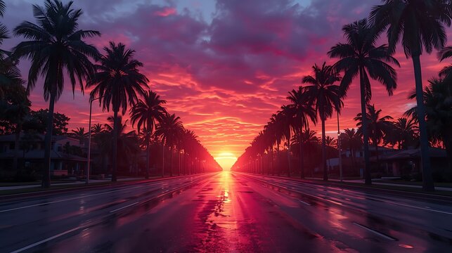 Cinematic tropical boulevard lined with tall palm trees during vibrant sunset, ultra-realistic reflections on wet asphalt, dreamy futuristic neon sunset tones