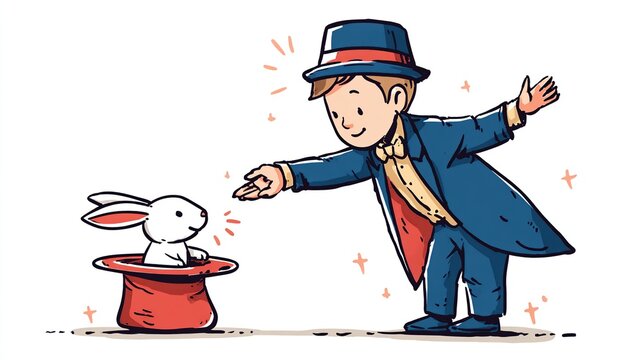A cheerful young magician in a top hat and tails gestures toward a white rabbit emerging from a red top hat; stars and sparkles surround them, suggesting a magical act