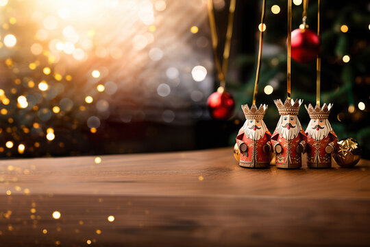 Christmas tree decorations in the form of the Three Wise Men against, sparkling bokeh. Religious holiday of Epiphany