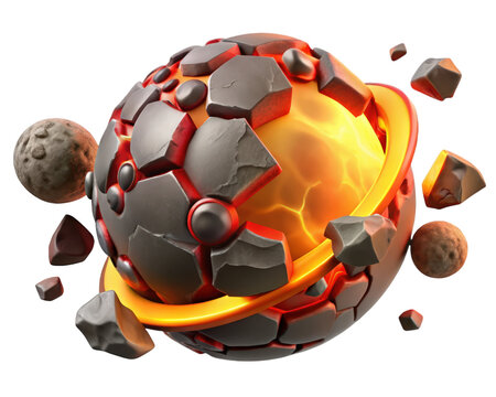 Cartoonish broken planet with magma core and rocky crust surrounding by asteroids,illustrative style 3d illustration isolated on transparent background