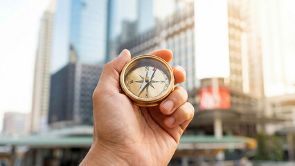 ビル街できらりと光る黄金のコンパスが示すビジネスリーダーが握る未来の希望