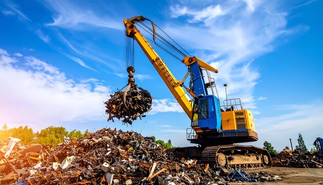 Yellow and Blue Crane Lifting Scrap Metal Against a Bright Blue Sky