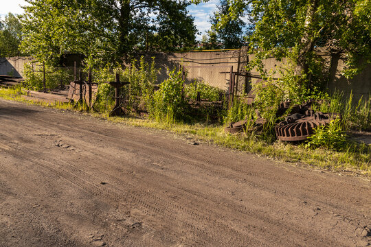 production parts, high-pressure cylinder frames, crane magnets overgrown with grass along the fence