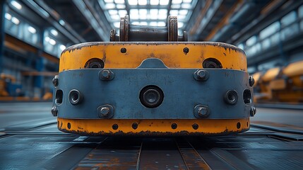 Heavy yellow crane lifts concrete block with black stripes using magnetic equipment. Industrial machinery with tracks, power, strength, used in construction, demolition, salvage operations.