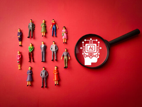 Blue digital human figure examined with magnifying glass on circuit board. Orange figures blurred behind. Concept of ai human resources talent search, digital identity, and tech analysis.
