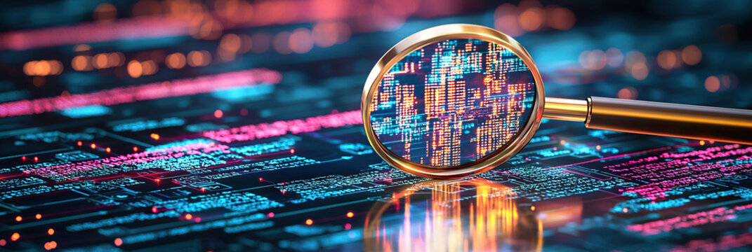 Magnifying glass hovers over digital screen displaying colorful data and code, symbolizing analysis and investigation technology. vibrant colors and close up view create futuristic and analytical