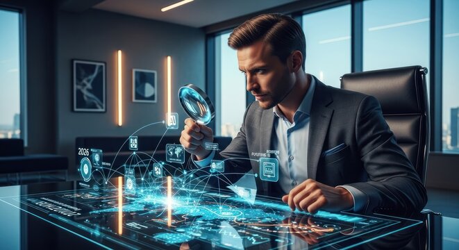 Businessman holding magnifying glass focusing on year 2026 with digital icons of innovation, AI, analytics, and global strategy. Concept of future planning, technology trends and vision.