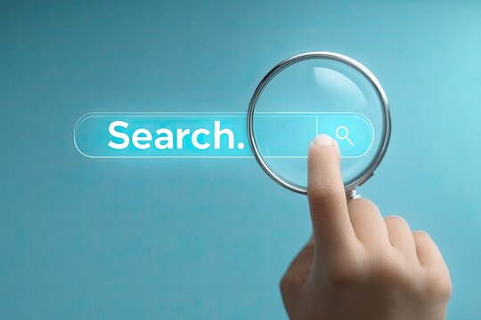 Isometric view of a magnifying glass exploring a digital interface, representing online search, data analysis, and information discovery for technology