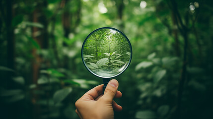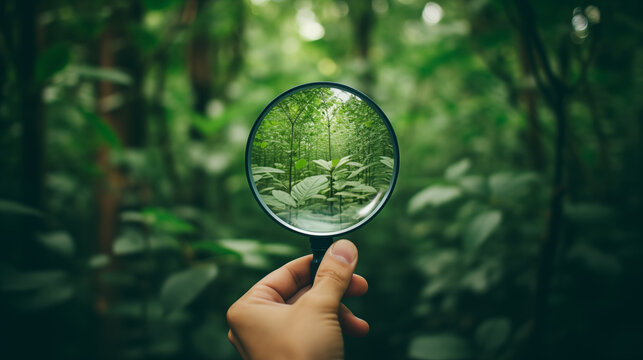 Hand holding a magnifying glass on green nature background.