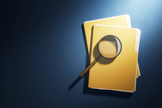 Yellow file folder stack with magnifying glass under spotlight from top view on dark blue desk background symbolizing investigation or research concept. 3D Rendering