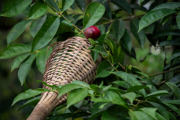 Traditional bamboo fruit picker tool harvesting a ripe red God's Crown fruit (Phaleria macrocarpa) on a tree. Manual agricultural equipment.