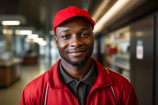 Generative AI image of handsome man postman mail carrier wear uniform standing in the warehouse
