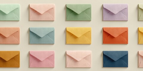 Colorful origami paper envelopes arranged on dark textured background. Creative mail art composition with vibrant folded letters in rainbow colors.