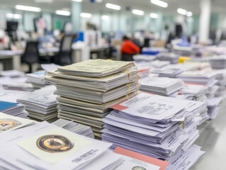 Transparent ballot box filled with white envelopes as one is dropped into the slot, symbolizing voting and democracy on a minimalist yellow and white background